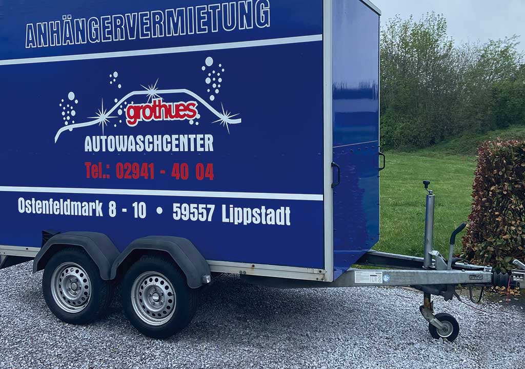 Das GROTHUES Waschcenter vermietet blaue Anhänger in verschiedenen Größen und Ausführungen. Wir beraten Sie gern.
