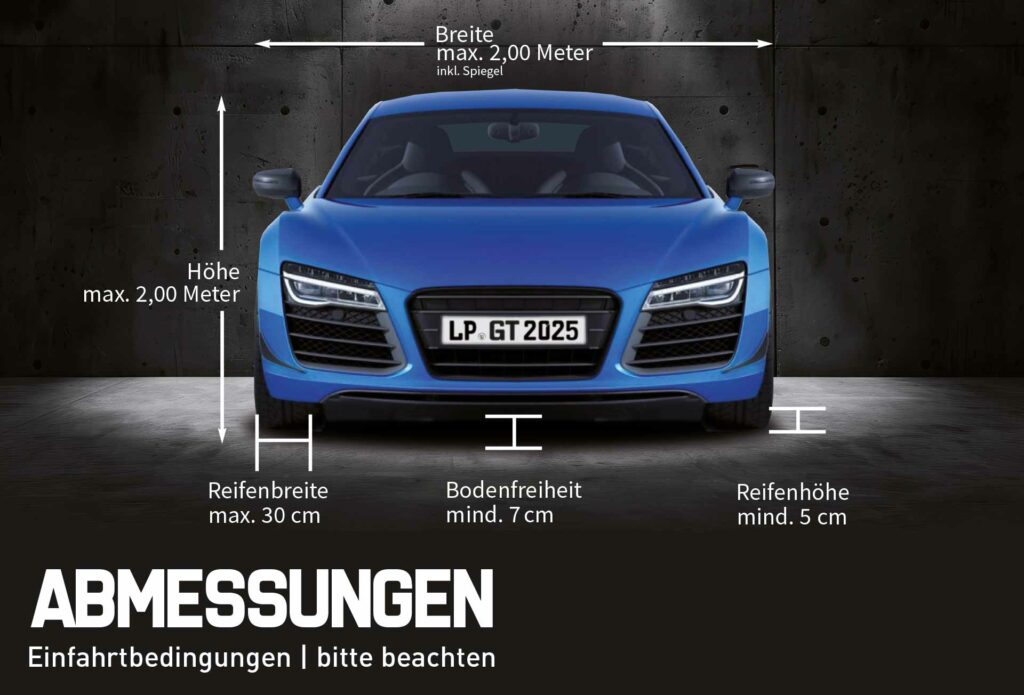 Bitte beachten Sie unsere Einfahrtbedingungen (gelten für den kompletten Durchlauf des Waschvorgangs) sowie die Minimal- und Maximal-Abmessungen Ihres Fahrzeugs in relevanten Bereichen: