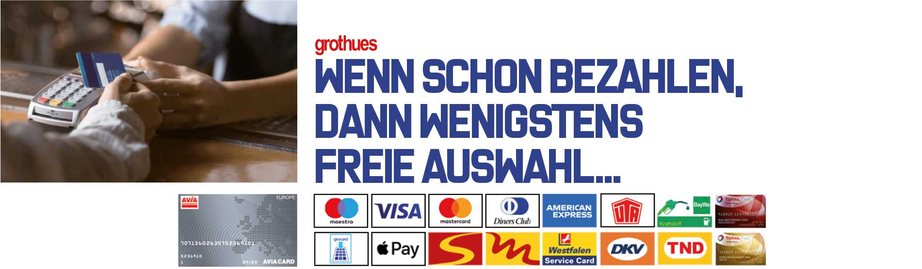 Bei GROTHUES tankt man „à-la-carte“: Am besten mit der beliebten Kundenkarte „AVIA-Ring-Card“. Aber auch mit den Karten von TOTAL, SHELL, WESTFALEN, UTA, DKV, Novofleet und BayWa sind echte Tank-Profis bei uns bestens aufgehoben.